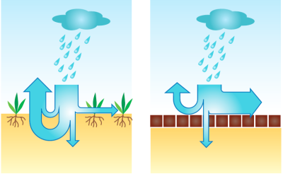 Na obrázku je vidět přirozený koloběh vody s porovnáním v městské zástavbě bez regulace
